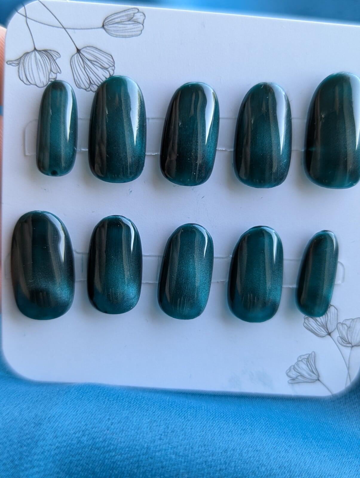 These press-on nails are absolutely stunning! The dark shade with the cat-eye finish looks so rich and luxurious. The magnetic effect catches the light beautifully and gives a high-end, salon-quality look. Easy to apply, comfortable to wear, and stayed on perfectly. I’m beyond satisfied!